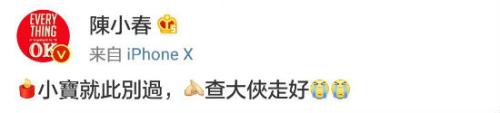 30日,陈小春也在微博中,以韦小宝的口吻悼念金庸先生——“小宝就此别过,查大侠走好”。