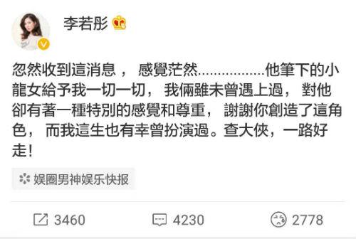 1995年在《神雕侠侣》中饰演小龙女,后又出演《天龙八部》的李若彤在微博里这样写到,“他笔下的小龙女給予我一切一切,我俩虽未曾遇上过,对他却有着一种特別的感觉和尊重,谢谢你创造了这角色,而我这生也有幸曾扮演过。查大侠,一路好走!”(完)
