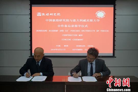 图为2018年9月21日,敦煌研究院与意大利威尼斯大学签署合作备忘录,双方就派遣和接收实习生参加相关实习和促进双方机构人员学术交流达成共识。敦煌研究院供图