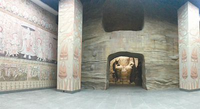 在青岛城市传媒广场3D打印的云冈石窟第三窟外景和壁画。资料图片