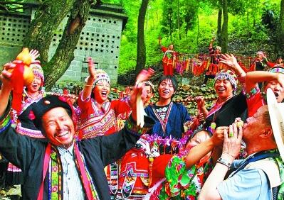 广西东兰县大同乡弄彦村瑶族同胞在欢迎游客。刘廷智摄/光明图片