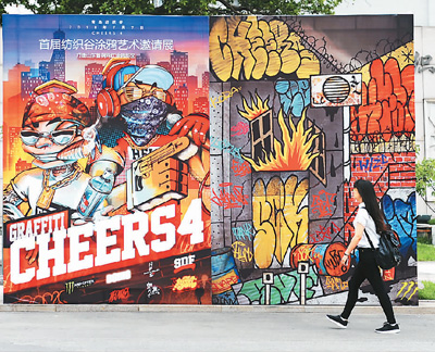 图为游客走过青岛纺织谷涂鸦宣传画前。 王海滨摄(人民视觉)