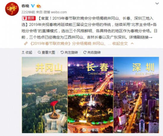 中新网客户端12月27日电(记者 宋宇晟) 央视综艺频道今日公布了2019年春节联欢晚会分会场。记者获悉,2019年央视春晚将延续前三届设立分会场的传统,继续采用“北京主会场+各地分会场”的直播模式,选出三个风格鲜明、各具特色的地区作为春晚分会场。分会场已确定为江西井冈山、吉林长春以及广东深圳。目前筹备工作秩序井然,进展顺利。