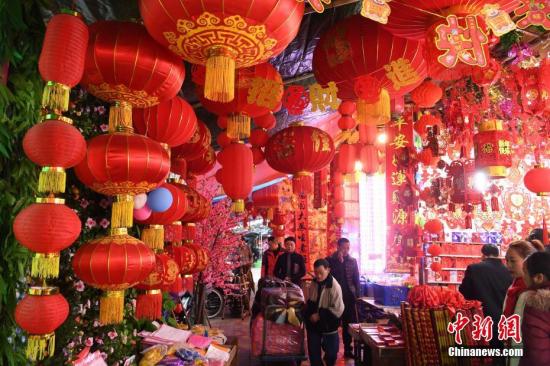 资料图:1月15日,随着农历猪年春节临近,重庆朝天门批发市场挂满了红红的灯笼及各种装饰品。陈超 摄