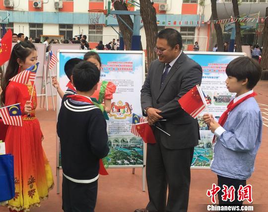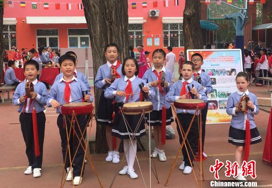 中新网北京4月23日电 (记者 杜燕)中外学生一起唱京韵大鼓、与大师们共同做毛猴……今天,北京市朝阳区实验小学里举办了一场“‘一带一路’手拉手 ‘一班一国’看世界”主题实践活动,吸引了来自意大利、马来西亚、秘鲁等12个国家的大使、大使夫人、参赞以及30名巴基斯坦小学的学生体验中国传统文化项目。
