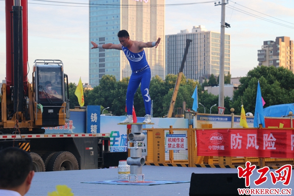 图为优秀杂技演员、非遗文化传承人梁天宇表演杂技《挑战巅峰》