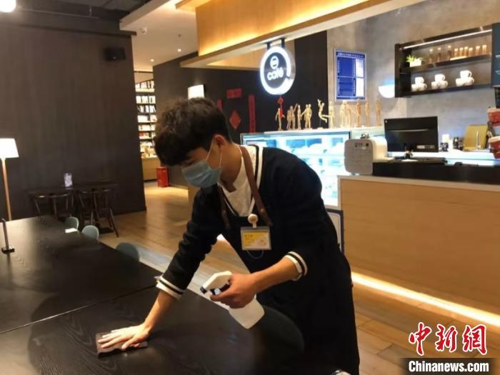 资料图:成都某书店内,员工正在给桌子消毒。 钟欣 摄
