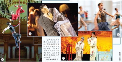 ①上海杂技团杂技剧 《战上海》剧照。②上海歌舞团舞剧 《永不消逝的电波》剧照。③上海昆剧团昆剧 《临川四梦》剧照。④上海芭蕾舞团演员戴着口罩认真训练。 均本报资料照片 制图:李洁