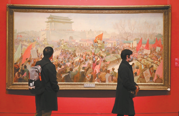 展览中观众驻足欣赏巨幅名作《北平解放》。