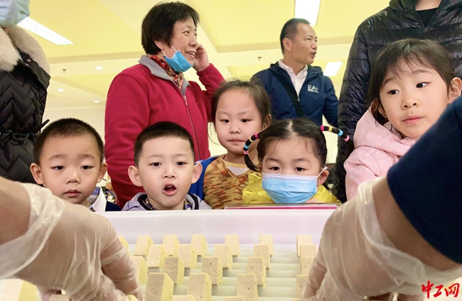 图为老字号王致和非遗文化进社区公益活动,社区小朋友们在观看“摆块”腐乳酿造技艺展示。(摄影/李文凯)