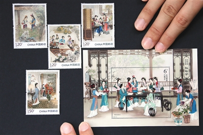 中国邮政22日发行《中国古典文学名著——〈红楼梦〉(三)》特种邮票1套4枚,小型张1枚,全套邮票面值为11.1元。中国邮政曾在2014年和2016年发行《中国古典文学名著——〈红楼梦〉(一)》和《中国古典文学名著——〈红楼梦〉(二)》邮票,分别表现了小说场景的不同回合。图为当日,集邮爱好者在展示该特种邮票。