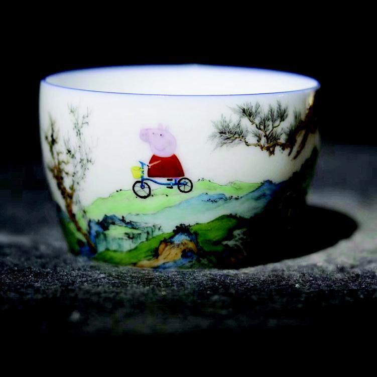 日前,一只白色瓷杯的图片被网友热传。白色通透的杯身、传统的青山绿水、还有骑着车一脸愉悦的小猪佩奇,让这只瓷杯显得十分别致。