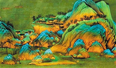 在中国十大传世名画中,有两幅诞生于宋徽宗时期,一幅为世俗繁华的史诗——《清明上河图》,另一幅为锦绣河山的颂唱——《千里江山图》。作为北宋时期的一幅青绿山水孤品,《千里江山图》全幅构图景象开阔,取用传统的散点透视法,以略带俯视的角度横向展开了全景式大山大水,气势宏大。