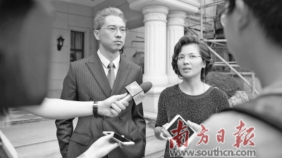 刘涛和王雷在拍摄现场接受媒体采访。 南方日报记者 李细华 摄
