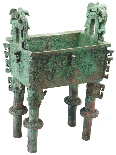 柱足上装饰扉棱,柱足中部装饰圆盘,在商周青铜器中独一无二。历史价值与艺术价值极高,堪称国之瑰宝。