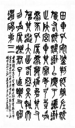在吴昌硕留下的明确标注时间的石鼓文临摹作品中,可以看到他长期临摹石鼓文,并且在75岁至78岁达到一个高峰时期,从这些临摹石鼓文的作品中可以很明显地看到吴昌硕用笔方法与行笔力量的变化,早期书写线条端正细劲,越往后期,尤其是到了60岁之后,用笔线条变得厚重朴拙,充满生命力,逐渐有了金文的风格和笔法,实现了从临摹到领悟的创立。吴昌硕在临写中没有完全按照原文临摹,而是不断用自我体悟对笔法、结体、章法等进行创新,因此,沙孟海评价说:“世人或以为先生写《石鼓》不似《石鼓》。由形貌上,确有不相似处。岂止先生功夫到家,遗貌取神,用他自己的话说是‘临气不临形’的,自《石鼓》发现一千年来,试问有谁写得过先生?”在诸多临摹学习石鼓文的书法家中,吴昌硕可以称得上是将临摹实践升华为艺术创造的第一人。