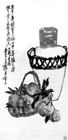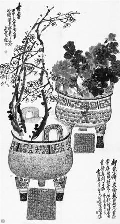 吴昌硕用他一生的功力研习石鼓文,开创了石鼓文的新貌,他的绘画也因此以浓厚的金石之风入画,创造了奇崛雄强、古拙郁勃的金石写意画风,这其中有他篆刻与书法的功力,也有他钻研石鼓文等秦汉金石文字的功底。他说:“今人但侈摹古昔,古昔以上谁为宗”。并主张“古人为宾我为主”,力图将学古和创新融合为一体,形成了一种以古开今的独特艺术风貌。在这其中,可以说,石鼓文成就了吴昌硕,使他具备了打碎揉化再创造的胆魄,寻找到了一种独具风貌的艺术语言,也激发他在划时代的关键节点上中走出了一条不同寻常的路。