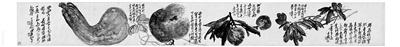 这就不难理解,吴昌硕的大写意绘画能有“划时代”的价值,很大程度上正是以书入画的结果。60岁以后,吴昌硕逐渐显示出了篆籀笔法在描摹花卉中的特点,从枝干的老辣雄强,到布局章法的对角斜势,左右穿插,疏密揖让,错落有致,都是在石鼓篆书的影响下形成的,正如他在《西泠印社醉后书赠楼村》诗中云:“奇书饱读铁能窥,蜾扁精神古籀碑,活水源头寻得到,派分浙皖又何为?”在画面意象上,吴昌硕在反复临写石鼓文的过程中体悟到其中蕴含的气息和力量,也找到了与自己艺术表达相符的契合点,崇尚画面气势,以浑厚之姿表现花鸟之态,整个画面充斥着摄人心魄的大气磅礴,可谓是“苦铁画气不画形”“不似之似聊象形” 。画家齐白石曾有言:“青藤雪个远凡胎,老缶衰年别有才。我欲九原为走狗,三家门下转轮来。”就连一向傲气的齐白石也能出此言,那真算得上是佩服得五体投地的铁杆粉了。
