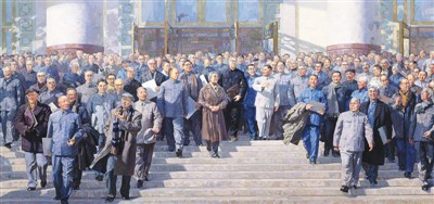 在这一进程中,主题性美术创作从以往正襟危坐的创作姿态,转换为相对平易亲和、充盈着个体情感的表达。这在周思聪上世纪80年代创作的现代水墨画作品《矿工图》系列中亦可见一斑,鲜明生动、夸张变形的人物形象,深度强化了悲剧叙事中人物造型的感染力。唐勇力的《新中国诞生——开国大典》、冯远的《世纪智者》、李伯安的《走出巴颜喀拉》、赵奇的《京张铁路·詹天佑和修筑它的人们》、袁武的《抗联组画》、李翔的《民以食为天》等作品,也都在葆有个人艺术语言特点的同时,显现了鲜明的时代性与史诗风格。