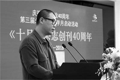 青年作家石一枫作为作家代表发表致辞,向《十月》创刊40周年表示祝贺,并表达美好祝愿。他说:“在把《十月》当做枕边书的年月里,我能感到它一直在以鲜活、平易而勇敢的姿态面对生活,面对中国的社会和历史变化。对于我这样一个在文学道路上的后来者而言,能够在《十月》杂志上发表作品感到荣幸备至。如果要把书本比喻成朋友,那么《十月》也具有一个挚友的种种美德——勤勉、真诚、宽厚,睿智而不卖弄技巧,亲和而不流于世故。这一切的品格是与编者的品格一脉相承的,因此致敬这本杂志就是致敬它的编者。”