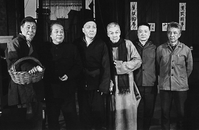 郑榕(左一)于是之(左三)蓝天野(左四)与舞台技术人员合影