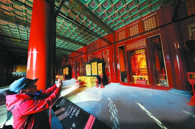 寿皇殿正殿局部还原清光绪年间情景。寿皇殿建筑群试运营推出《景山寿皇殿历史文化展》,向游客讲述寿皇殿的前世今生。
