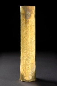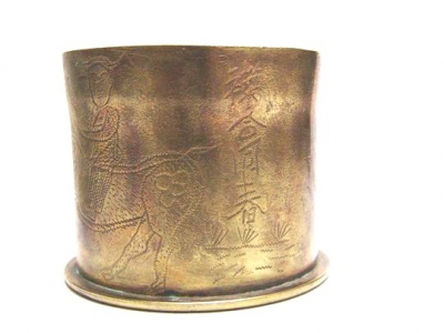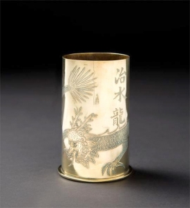 第一次世界大战期间,14万华工远赴欧洲。这些华工大多数来自山东威海的农村地区,在战争的间隙,这些质朴的华工用他们的巧手在炮弹壳上“雕刻”出精美的图案,写上诸如“禄合同春”的祝语和愿望。