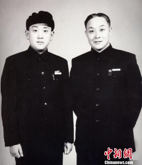 尚长荣向中新网记者介绍旧相片中的人物。 康玉湛 摄