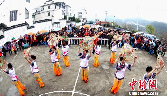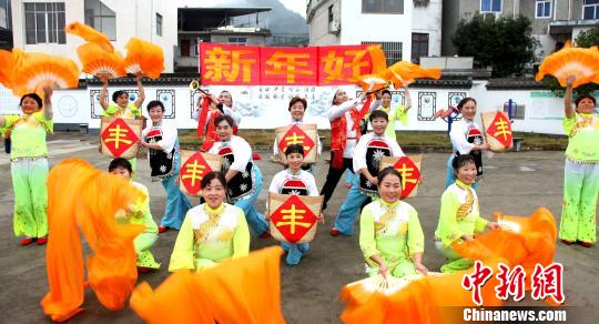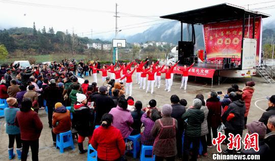 12月26日,安徽歙县文化馆和徽城镇中和社区“徽州香情舞蹈队”开着文化大蓬车送戏到该县坑口村,与村民一起迎新年。