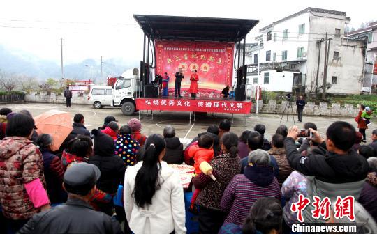 12月26日,安徽歙县文化馆和徽城镇中和社区“徽州香情舞蹈队”开着文化大蓬车送戏到该县坑口村,与村民一起迎新年。图为文化大蓬车演员在安徽歙县坑口村表演 吴建平 摄