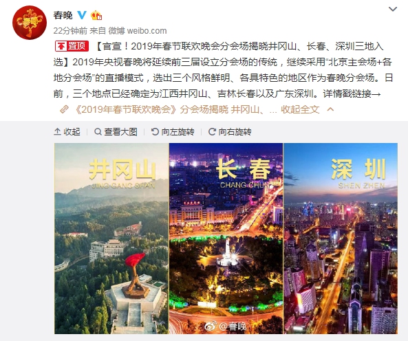2019春晚会分会场揭晓 井冈山、长春、深圳三地入选