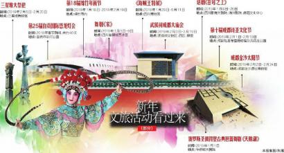 据介绍,成都将推出“过节耍成都”系列活动、西岭雪山第19届南国国际冰雪节等活动,并联合第十五届成都美食旅游节、2018美食之都成都火锅文化月、2019新春欢乐购等品牌节会,通过邀请外地游客来蓉体验“成都年”,进一步拉动成都文化旅游消费增长。川东北地区主要以冰雪旅游、春节民俗文化体验游为特色,推出第四届曾家山冰雪节、阆中阆苑仙葩灯会、巴人祈福朝圣庙会、天曌山梵天寺新春祈福庙会等活动。川南地区则以文化体验游为特色,推出自贡国际恐龙灯会、川南春酒文化体验活动等。攀西、川西北地区推出的相关旅游活动主要以冬日阳光游和少数民族地区风情游为特色,包括了邛海阳光湿地音乐季、米易灯会等。