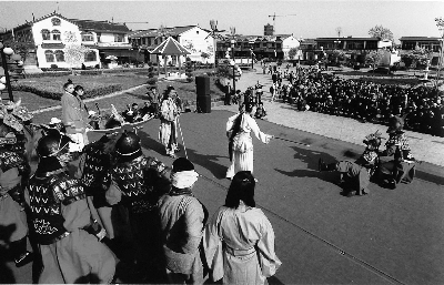 “张大娘,快走,村头广场唱大戏了,从市里来的专业演员,唱的是你最爱听的柳琴戏。”2018年12月23日,滕州市级索镇前杨岗村百余名村民闻讯赶到村头的文化广场,观看市柳琴戏研究保护中心的老年文艺轻骑兵们带来的精彩演出。“天怕浮云地怕荒,鱼怕垂钩雁怕伤。草怕严霜霜怕日,小孩子就怕晚来的娘。”72岁的老党员、国家二级演员彭国玺一首竹板书《怕》字正腔圆,引来村民阵阵掌声。随后,《张彦休妻》《白玉楼》《卖驴》等曲调婉转的柳琴戏唱段让村民们时而感动落泪,时而开怀大笑。