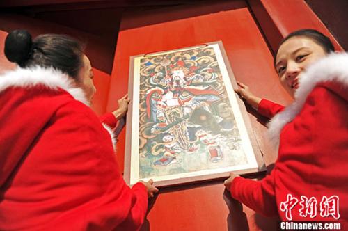 资料图:古风装束的工作人员合力悬挂门神。 孙昊声 摄