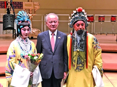 中国驻美大使崔天凯与京剧名家于魁智(右)、李胜素(左)