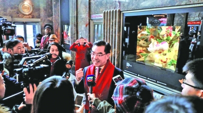 中国驻纽约总领事黄屏在帝国大厦“欢乐春节”猪年生肖橱窗展开幕后接受记者采访