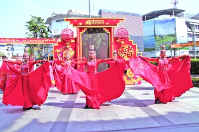 2019年泰国“欢乐春节”活动曼谷中国城演出现场。图为蒙古族舞蹈《顶碗舞》。