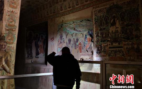 莫高窟“巡诊医生”拿着手电筒仔细查看佛像。 南如卓玛 摄