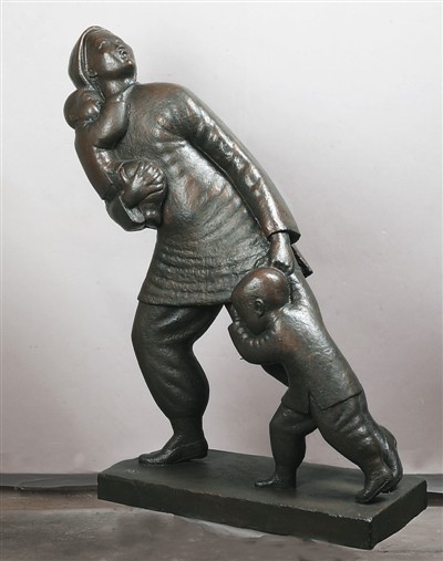 在徐悲鸿的帮助之下,1933年,滑田友也就读于巴黎高等美术学院。年轻的中国艺术家身处异国,仍不忘祖国危难。1938年,滑田友在法国创作了《轰炸》样稿。作品中的母亲惊恐回首,看着空中飞来轰炸的日军飞机,右手搂着怀中婴儿,左手拉着孩子快步逃离。这件控诉战争罪恶的雕塑,以小见大,既体现西方古典主义雕塑在扎实造型与理想结构上的呈现,又吸收了中国传统雕塑中的线性美与整体美,是表现战争题材主题性创作的现代经典作品。