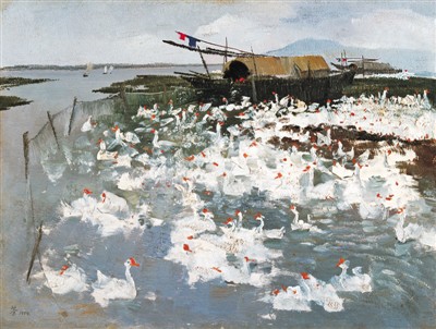 吴冠中于1946年—1950年就读于巴黎高等美术学院。《太湖鹅群》创作于1974年,是吴冠中具有写生色彩的代表性油画作品。此作尺幅不大,笔触轻松,色彩丰富,虚实结合,表现了水上人家以及百余只白鹅,生活气息浓厚。在创作上,有的白鹅仅寥寥数笔即予以呈现,言简意赅,显示出作者捕捉形态的高超能力。