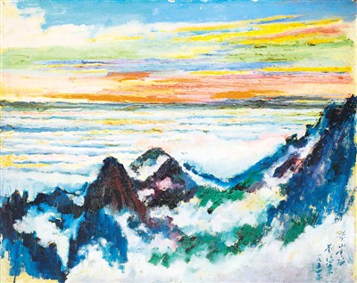《黄山云海》是刘海粟家属新近捐赠给中国美术馆的作品。云海是黄山独特的自然景观,置身其中犹入蓬莱仙境,令人神思飞越,浮想联翩。尤其是在日出和日落时分所形成的彩色云海,最为壮观。《黄山云海》是刘海粟1954年所作,系其六上黄山创作的油画精品。作者通过强化大面积的横向云、霞,以及因日光普照而生出的天空与云海交错之感,因山势向上而形成的云气横流,使得整幅作品气象万千、富有张力。
