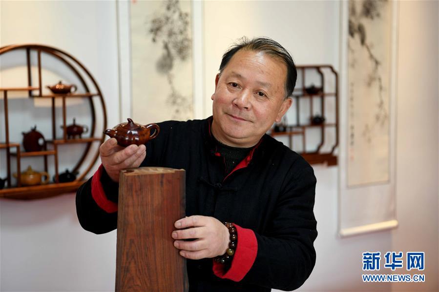 4月12日,桂雪在工作室内展示一把木壶及制作原料。家住安徽省宣城市泾县泾川镇岩潭村的桂雪是安徽省宣城市非物质文化遗产木壶艺术的技艺传承人,一块块不起眼的木头,经过他的雕琢打磨,变身一把把古朴典雅的袖珍木壶。近10年来,桂雪潜心研究木壶工艺,逐渐摸索出自己的木壶制作技艺。桂雪说,制作一件木壶需要经过选料、制胚、掏堂、凿把、修边、琢磨、抛光等十几道工序,制作难度大,工期长。桂雪至今只做了约200把木壶。近年来,桂雪通过非遗展示、讲课交流等方式弘扬传统木壶技艺,让更多的人了解了这门手艺。新华社记者 刘军喜 摄