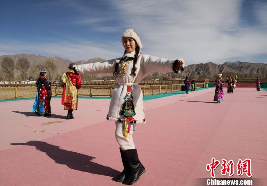 草原为T台,蓝天白云雪山为“T台秀”背景,娜仁其其格带领当地牧民穿上自己做的蒙古族服饰,走起“秀”来,向游客展示介绍其民族服饰。 丁思 摄