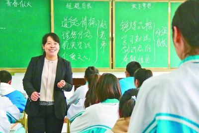 在新疆且末县第二中学,青年教师侯朝茹带着学生进行主题班会讨论。新华社发