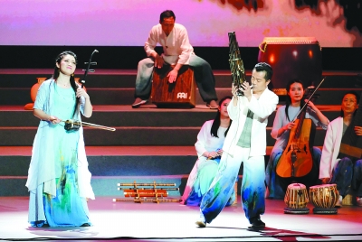 在音乐风格方面,《共同家园》尝试突破传统的“民乐”定义,将中国民乐置于“世界音乐”语境之中,这样的创作视角为整台音乐会提供了广阔的艺术空间。演出现场,竹笛、二胡、琵琶等观众熟悉的中国民族乐器,与世界民族乐器碰撞出全然不同的音乐体验。在一首首精心编创、风格多样的原创曲目中,观众既能欣赏到尺八、亚美尼亚管、南亚塔布拉鼓苍茫的远古之音,亦可感受手碟、电声乐队等现代乐器的时尚气质,更能在二胡与马头琴、琵琶与西班牙吉他、阮族与俄罗斯三角琴乐队的深情对话中,体会世界各民族音乐多元交融、兼容并蓄的和谐之美。国际音乐大师谭盾的民族管弦乐作品《风与鸟的密语》则创造性地将民族管弦乐队与手机这一极具象征意义的当代符号交响互动,新颖的表现形式带来耐人寻味的音乐感受。