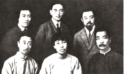 前排右起:鲁迅、许广平、周建人;后排右起:孙伏园、林语堂、孙春台