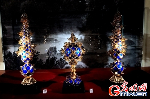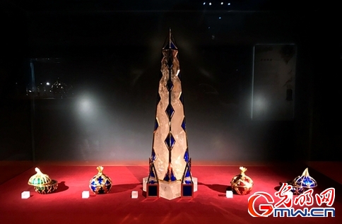 现场还展出了一件花盆造型的摆件。当时梅隆夫人得到了一颗极为罕见的94克拉克什米尔蓝宝石,宝石因其浓烈的天鹅绒蓝色调而备受推崇,梅隆夫人还订购了一个“盆”来放置这块特殊宝石。于是,史隆伯杰便将一株用黄金精制的蓝宝石花蕊植物,“种”进了一个本色赤陶移植盆中,也就形成了人们眼前这件匠心独运的花盆摆件。