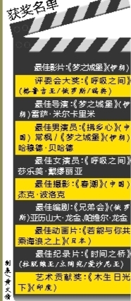 今年的颁奖典礼上,最佳男演员奖开出“双黄蛋”,由97岁高龄的《拂乡心》演员常枫和《梦之城堡》男主角哈穆德·贝哈德共同摘得。伊朗电影《梦之城堡》还摘得最佳导演、最佳影片两项大奖,成为当晚最大赢家。华语片《春潮》摘得最佳摄影奖。