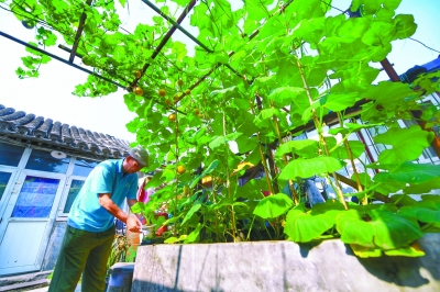 东四花友在打理葫芦架 本报记者 和冠欣摄