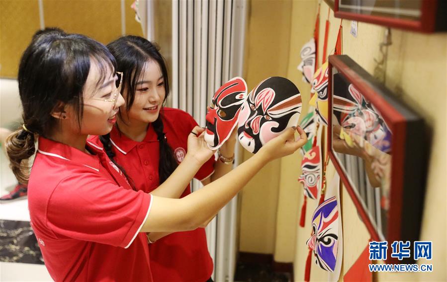 7月23日,在石家庄市长安区的国翠非遗馆,西安工业大学的大学生在参观脸谱作品。近日,石家庄国翠非遗馆举办“暑期实践学非遗”系列活动,包括面塑、剪纸、脸谱制作、手工编织技艺等非遗项目吸引众多非遗爱好者前来参观体验,在炎炎夏日感受非遗文化,乐享暑期时光。新华社记者 骆学峰 摄